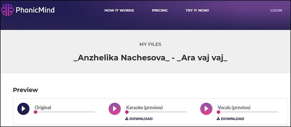 - После окончания процедуры обработки вы сможете, как скачать саму минусовку («Karaoke Preview»), так и сам вокал («Vocal Preview»), нажав на «Download» под ними.