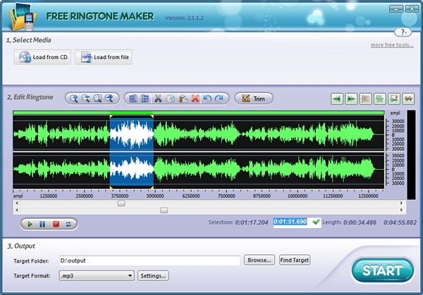 Free Ringtone Maker – программа специально разработанная для нарезки музыки под рингтоны. Программа Free Ringtone Maker представляет собой пошаговый мастер. Для сохранения необходимого участка музыки необходимо пройти три шага: выбор файла, выделить необходимый участок и сохранить результат. Кроме этого Free Ringtone Maker позволяет прослушивать созданный рингтон и добавлять эффект затухания звука.