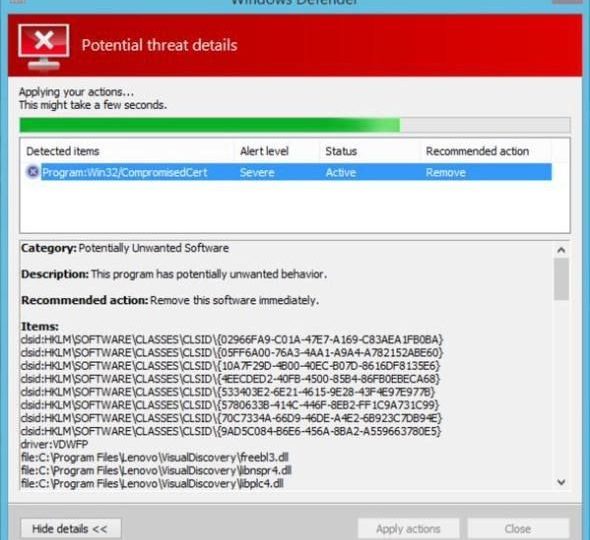 Теперь рекламное приложение Superfish может быть удалено с помощью бесплатного антивируса Windows Defender («Защитник Windows») от Microsoft. Он может восстановить и первоначальное состояние SSL-сертификата, который был модифицирован Superfish, и вернуть систему в нормальный режим работы.