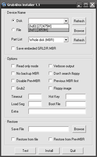 Выбираем пункт Disk и из списка выбираем свою флешку (в моем случае флешка на 4 Гб, поэтому выбрал hd1 3859 Mb). В поле Part List выбираем Whole disk (MBR). Если список пуст, нужно нажать кнопку Refresh, чтобы обновить список. После этого нажимаем кнопку Install.