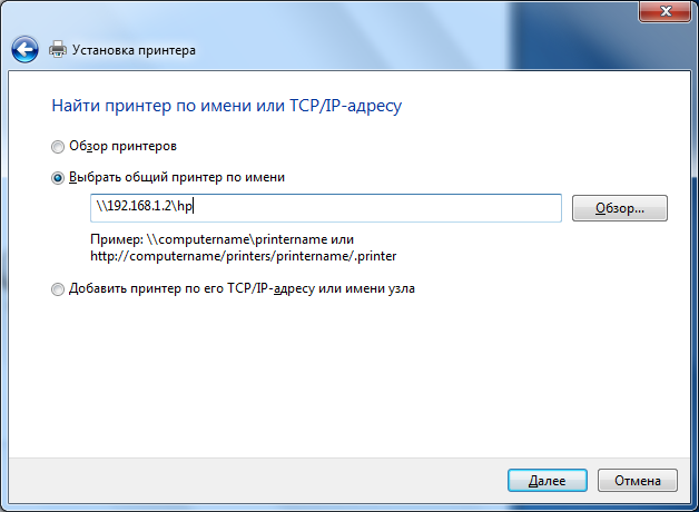 После чего появится окно, в котором можно вручную указать адрес сетевого принтера. Для этого выберите пункт «Выбрать общий принтер по имени» и введите адрес принтера в следующем формате: \IP-адресимя-принтера.