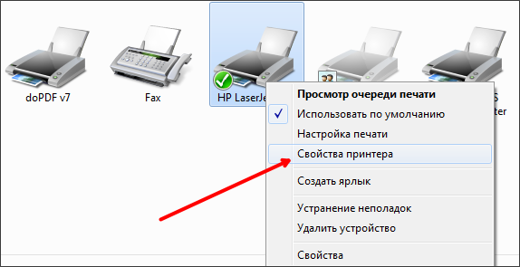После этого перед вами откроется список подключенных принтеров и других устройств. Здесь нужно найти принтер, который вы хотите использовать по сети, и открыть его свойства. Для этого кликните по нему правой кнопкой мышки и выберите пункт «Свойства принтера» (не путать с пунктом «Свойства»).