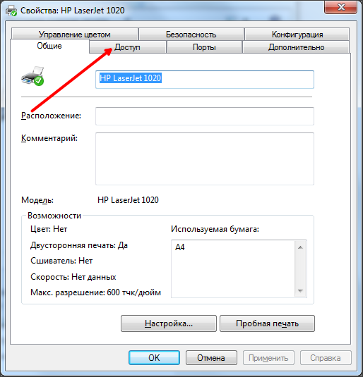 На вкладке «Доступ» вам необходимо установить галочку напротив пункта «Общий доступ к данному принтеру».
