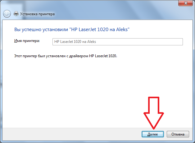 После этого нажмите на кнопку «Далее» и указанный вами принтер будет подключен и настроен автоматически.