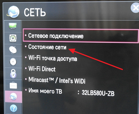 Итак, для того чтобы узнать MAC-адрес телевизора вам необходимо нажать на кнопку «Settings» на пульте ДУ и зайти в «Сеть – Состояние сети».