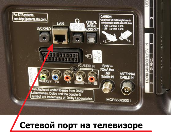 Дальше просто находим сетевой порт на обратной стороне телевизора (обычно он обозначается как LAN) и втыкам другую сторону кабеля в этот порт.