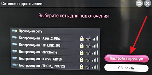 Если для подключения телевизора к Интернету через кабель вам необходимо вручную настроить подключение и задать статические IP-адреса, то это также можно сделать. Для этого нужно зайти в окно выбора сети, так как это описано выше, и нажать на кнопку «Вручную».