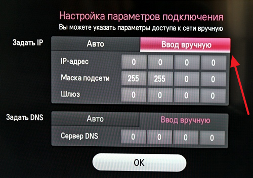 После этого на экране появятся ручные настройки сети. Здесь вы сможете указать статический IP адрес для телевизора, а также маску подсети, шлюз и DNS.