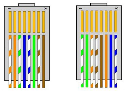 Для того чтобы понять, что кабель обжат как нужно, обратите внимание на проводники в коннекторах на обоих концах кабеля. Оранжевая и зеленная пара проводников должны быть как бы перепутаны друг с другом (см. картинку внизу).