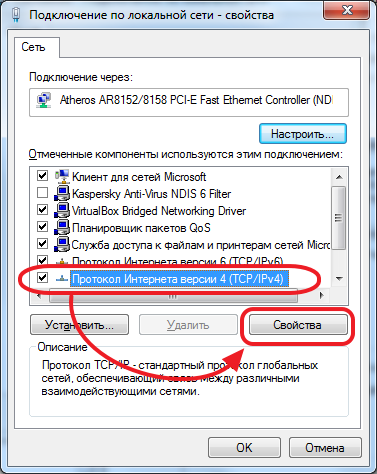 После этого выберите пункт «Протокол интернета версии 4» и снова перейдите в «Свойства».