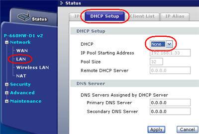 - в настройках модема через WEB-интерфейс необходимо в разделе Network->Lan открыть вкладку DHCPSetupи отключить DHCP-сервер;