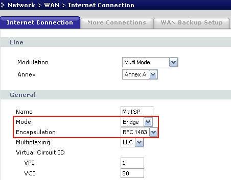 - далее необходимо зайти в меню Network->WAN. Взакладке Internet Connection ставимрежим «Bridge»;