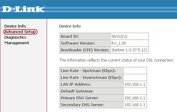 Когда эта операция успешно выполнена, можно переходить в WEB-интерфейс для начала настройки: в адресной строке браузера необходимо ввести 192.168.1.1 (для модема D-LinkDSL-2500UBRU):