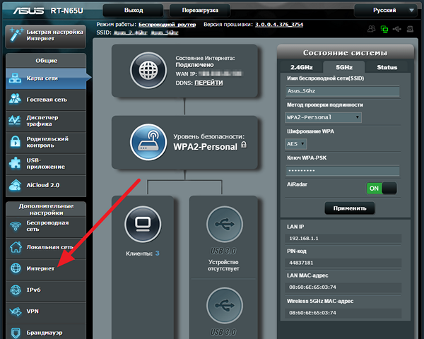 Для того чтобы открыть порты на роутере Asus вам необходимо перейти в раздел «Интернет», который находится блоке «Дополнительные настройки» (указано стрелкой).