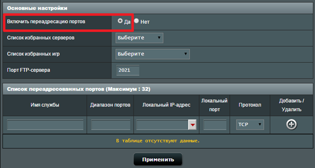 После попадания на вкладку «Переадресация портов» вы увидите два блока настроек «Основные настройки» и «Список переадресованных портов». В блоке основных настроек вам нужно включить переадресацию портов (переадресация портов и открытие портов это одно и тоже). Для этого просто переместите переключатель в положение «Да».