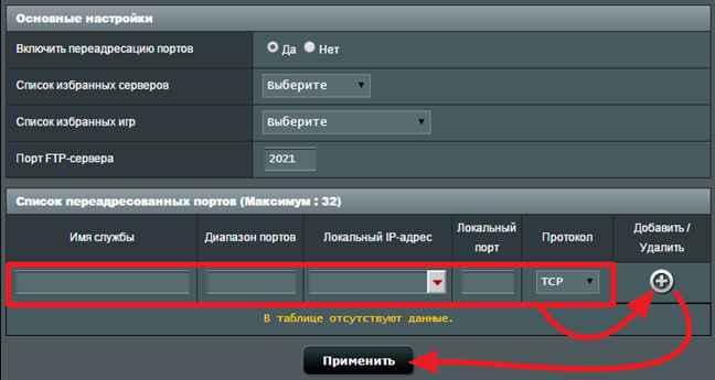 После этого можно начинать открывать порты. Для этого нужно заполнить форму в верху списка портов, нажать на кнопку «Добавить» и сохранить настройки нажатием на кнопку «Применить» (скриншот внизу).