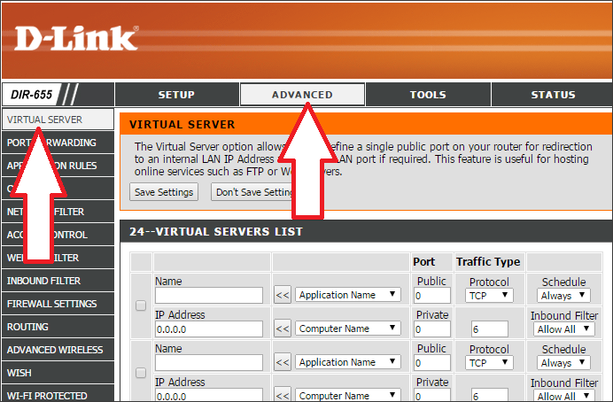 Если вы используете роутер D-Link с новым веб-интерфейсом (черного цвета), то для того чтобы открыть порт вам необходимо сначала перейти в «Расширенные настройки», а потом открыть раздел «Виртуальные серверы».