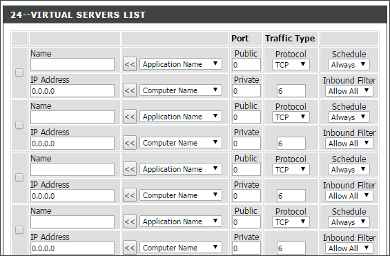 На этой странице «Virtual Server» вы увидите большую таблицу с пустыми полями. Для того чтобы открыть порт на роутере D-Link нужно ввести данные в эту таблицу и нажать на кнопку «Save Settings».