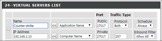 Для примера посмотрите на скриншот (ниже) с заполненной таблицей для игрового сервера Counter-Strike. Как видно трафик по порту 27017 перенаправлен на IP адрес 192.168.1.10.