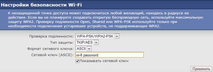 - поле аутентификации, определяющее тип шифрования, следует заполнить значением WPA2. Ключ – это и есть пароль. Выберите от восьми и выше символов;