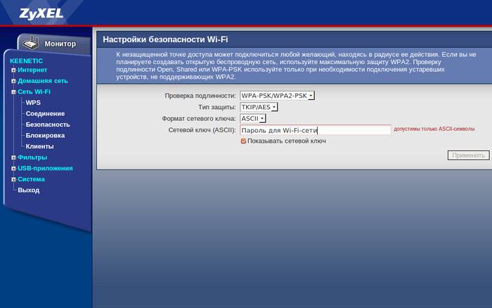 - перейдите на главу Wi-Fi и на вкладку «Безопасность». Здесь есть две наиболее важные строчки: Сетевой ключ (собственно, сюда и вводите новый восьмизначный пароль) и «Проверка подлинности», где лучше выставить параметр WPA2, как и везде;