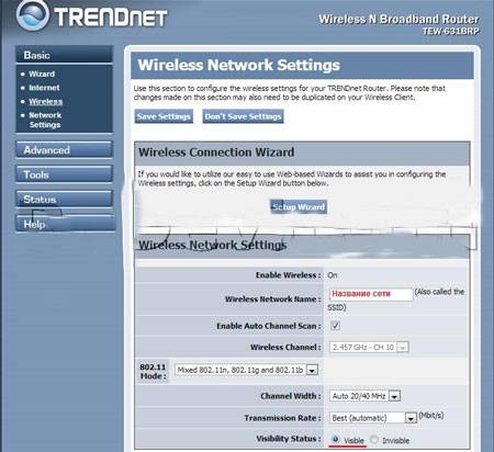 - далее нужно искать вкладку «Беспроводная сеть» или Wireless, где переходить в раздел настройки Wi-Fi (там будет поле «Тип шифрования» (AuthenticationType), где нужно в обязательном порядке выбирать значение WPA2- PSK (или что-то подобное). Здесь же есть название сети (SSID) и пароль-фраза (Passphrase, пароль и т.п.));