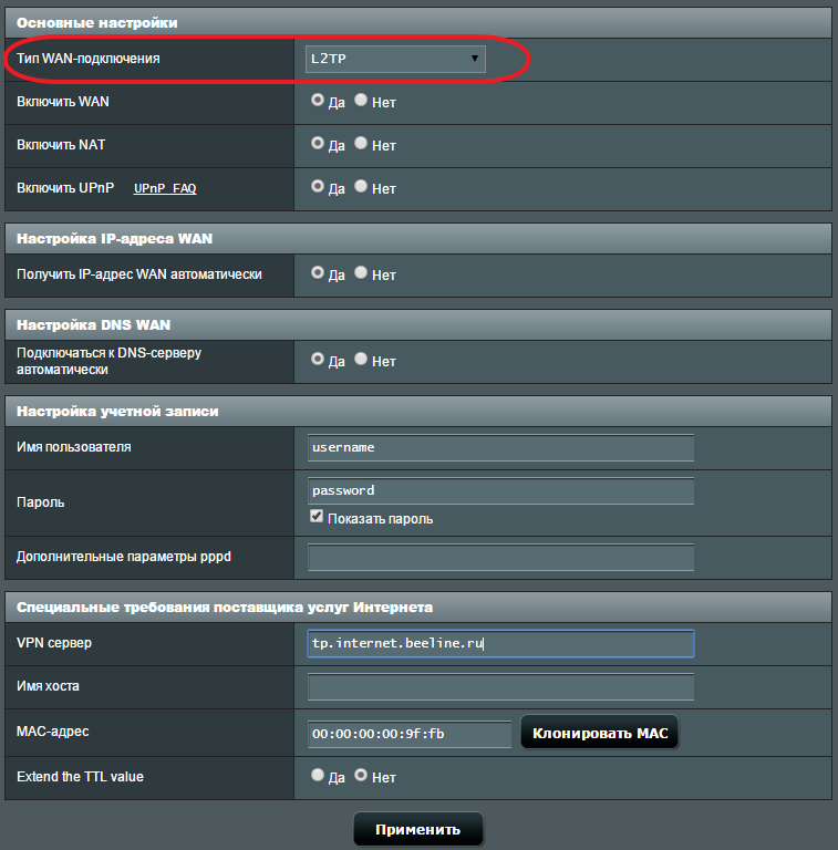 Самое главное не ошибиться с выбором типа подключения (на скриншоте внизу выделено красным). После выбора типа подключения меняется список доступных настроек. Поэтому если вы правильно укажете тип подключения, то дальнейшая настройка пойдет для вас намного проще. Для примера демонстрируем, как должны выглядеть настройки для Интернет провайдера Билайн (см. скриншот ниже).