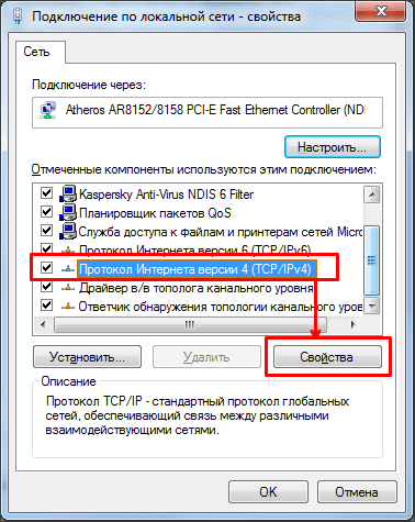 Дальше выделите пункт «Протокол Интернета версии 4 (TCP/IPv4)» и нажмите на кнопку «Свойства».