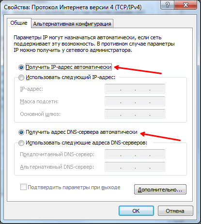В следующем окне нужно включить функции «Получить IP-адрес автоматически» и «Получить адрес DNS-сервера автоматически».