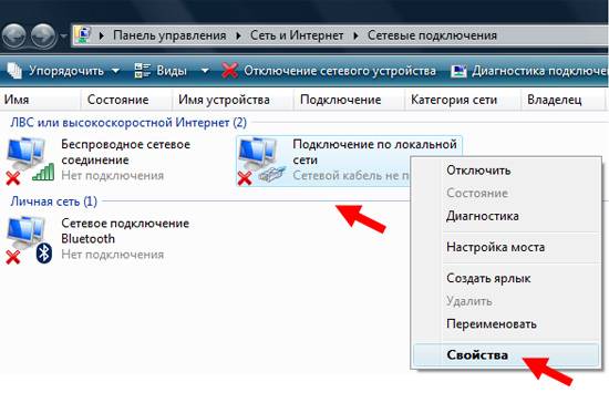 - перейти в «Подключение локальной сети», выбрать «Свойства»;