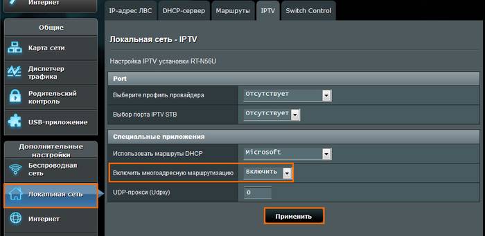 Точка доступа Asus обладает новой прошивкой, на которой выбор IPTV осуществляется при нажатии на вкладку «Локальная сеть» в меню «настройки маршрутизатора». В появившемся интерфейсе нужно указать, какой порт будет использоваться для подключения вашего TV-тюнера.