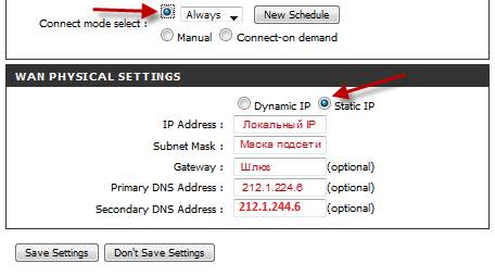 - при предоставлении провайдером статического ІР-адреса находится раздел WАN Physical Setting и там выбирается Static IP;