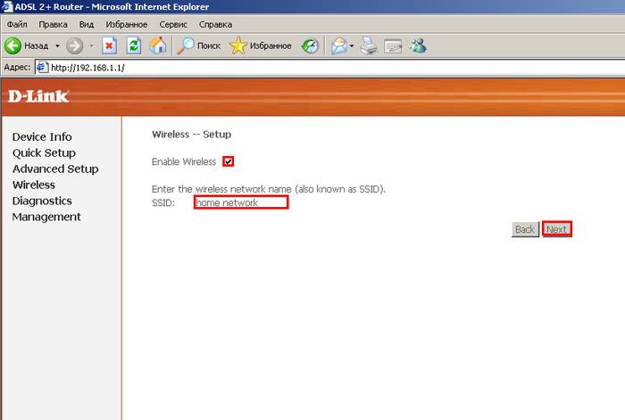 - поставьте галочку на строку Enable Wireless, заполните поле SSID и введите любое название сети, по Вашему желанию;