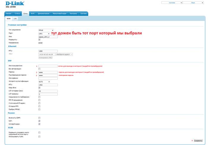 - перейдите на блок PPP и введите Ваш логин и пароль, который Вы получили у Интернет-провайдера;