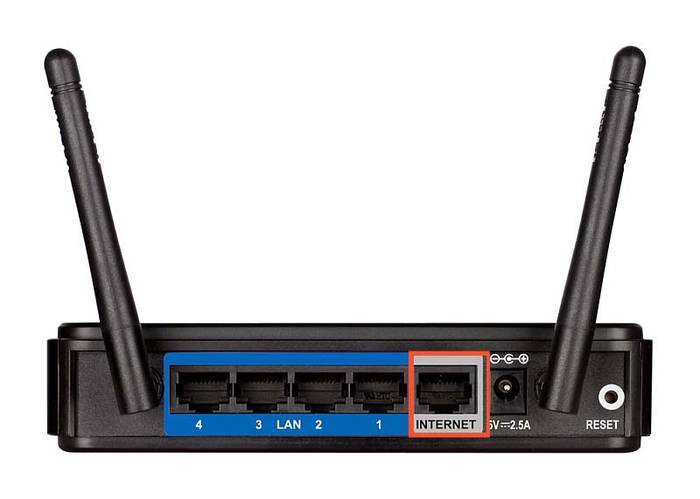 На задней панели роутера можно увидеть 6 гнезд. В одно из первых четырех подключается кабель, соединяющий роутер с сетевой картой стационарного компьютера. Следующее гнездо, пятое, с расположенной ниже надписью «Internet», служит для подключения сетевого кабеля, который обеспечит доступ в интернет роутеру.