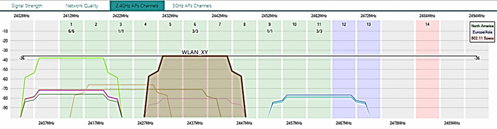 Рассмотрим еще один скриншот из программы Acrylic WiFi Home. Здесь уже другая конфигурация Wi-Fi сетей. На этом скриншоте больше всего загружены каналы с 6 по 13. В то время как канал 1 почти пуст.