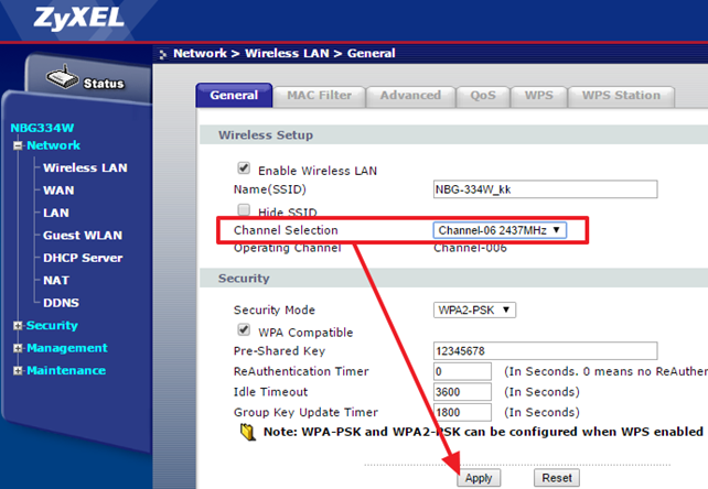 На роутере ZyXEL нужно открыть раздел «Network – Wireless LAN», поменять канал с помощью выпадающего списка «Channel Selection» и сохранить настройки с помощью кнопки «Apply».