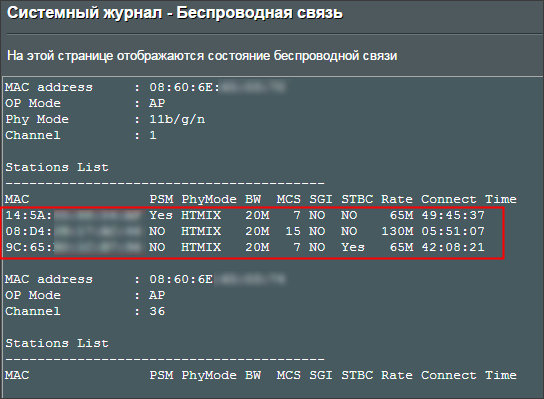 После этого перед вами должен открыться веб-интерфейс роутера. Здесь нужно найти раздел настроек, где отображается список всех подключенных к роутеру компьютеров. Например, на роутерах ASUS для этого нужно открыть раздел «Системный журнал» и перейти на вкладку «Беспроводная сеть».