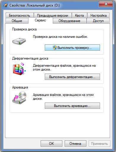 - переходим во вкладку «Сервис», потом «Проверка диска» и «Выполнить проверку»;