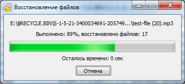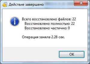 После того как все удаленные файлы будут восстановлены появится окно с информацией о количестве восстановленных файлов и затраченном времени.