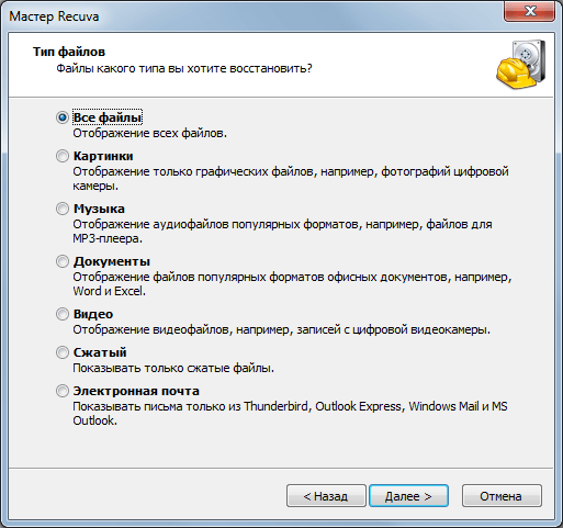Следующий шаг это выбор типа файлов. Перед вами откроется список из наиболее распространенных типов файлов. Выберите тип файлов, которые вы хотите восстановить. Например, если вы удалили фотографии, то выбирайте тип «Картинки», если вы удалили документы Word/Excel, то выбирайте тип «Документы». Если же вам нужно восстанавливать файлы разных типов, или нужного вам типа файлов нет в этом списке, то выберите вариант «Все файлы».