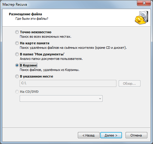 Если же вы не помните в какой папки лежали файлы до того как вы удалили их из корзины, то выберите вариант «В корзине». В этом случае программа Recuva будет искать все файлы, которые были удалены из корзины.