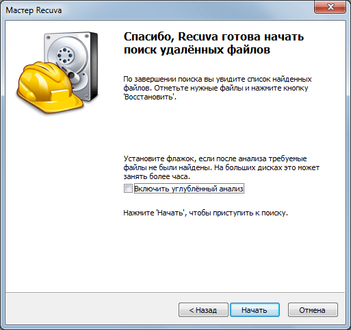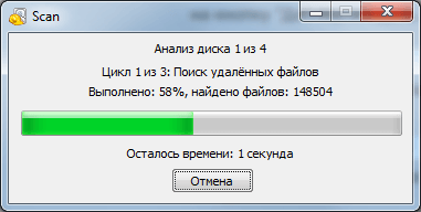 После нажатия на кнопку «Начать» запустится анализ диска. Время, которое необходимо на поиск удаленных из корзины файлов зависит от скорости вашего жесткого диска и настроек, которые вы указали ранее.