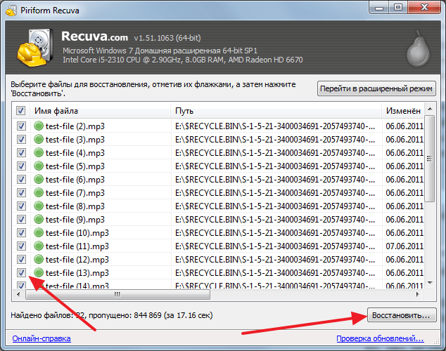 После того как файлы найдены, мы можем их восстановить. Для этого нужно установить галочки напротив нужных файлов и нажать на кнопку «Восстановить».