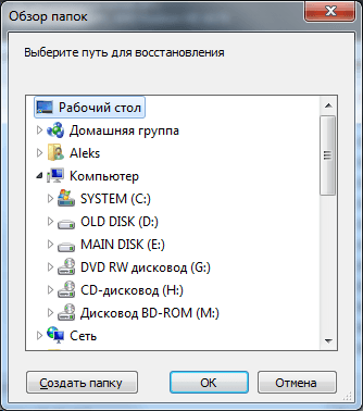 Дальше появится окно, в котором нужно поместить восстановленные файлы.
