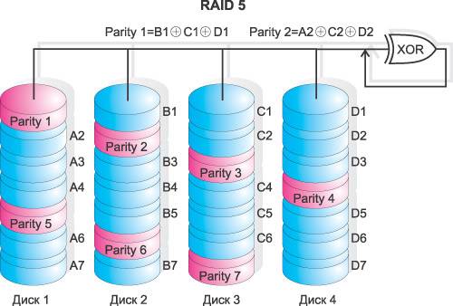 - RAID 5 – представляет собой массив, имеющий контроль четности. Чтобы создать такой массив нужно иметь как минимум 3 носителя. Полученный объем будет равен общей сумме дисков за вычетом одного. Такая схема позволяет сохранять сведения при возможных неполадках;