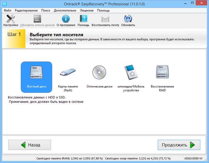 В главном окне программы необходимо только выбрать тип носителя и нажать кнопку «Continue», затем появится окно со списком разделов, в котором пользователь выбирает накопитель с которым будет работать.