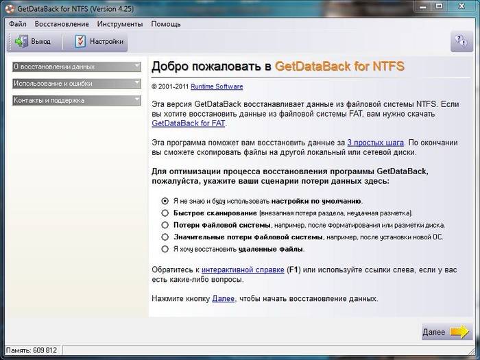 Мощное средство восстановления утерянной информации. Распространяется отдельно для ФС NTFS и FAT. Последняя подходит для съемных носителей (карты памяти, флэш-накопители). Независимо от типа удаления, GetDataBack скорее всего вернет их в полной сохранности, но только если с накопителем не проводили никаких операций записи.