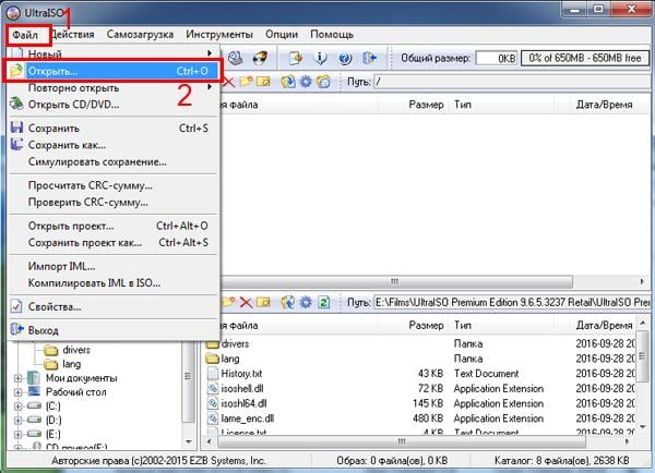 - Запускаете UltraISO и выбираете в верхнем меню пункты Файл – Открыть. После этого указываете путь к образу, который надо записать.