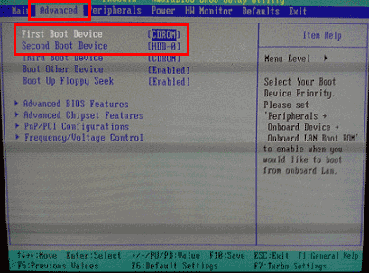 - Чтобы настроить в БИОСе загрузку с диска поставьте CDROM первым (First Boot Device), а жесткий диск (HDD-0 или Hard Disk) – вторым. Кстати, кнопки управления здесь другие, и они обычно указаны внизу.